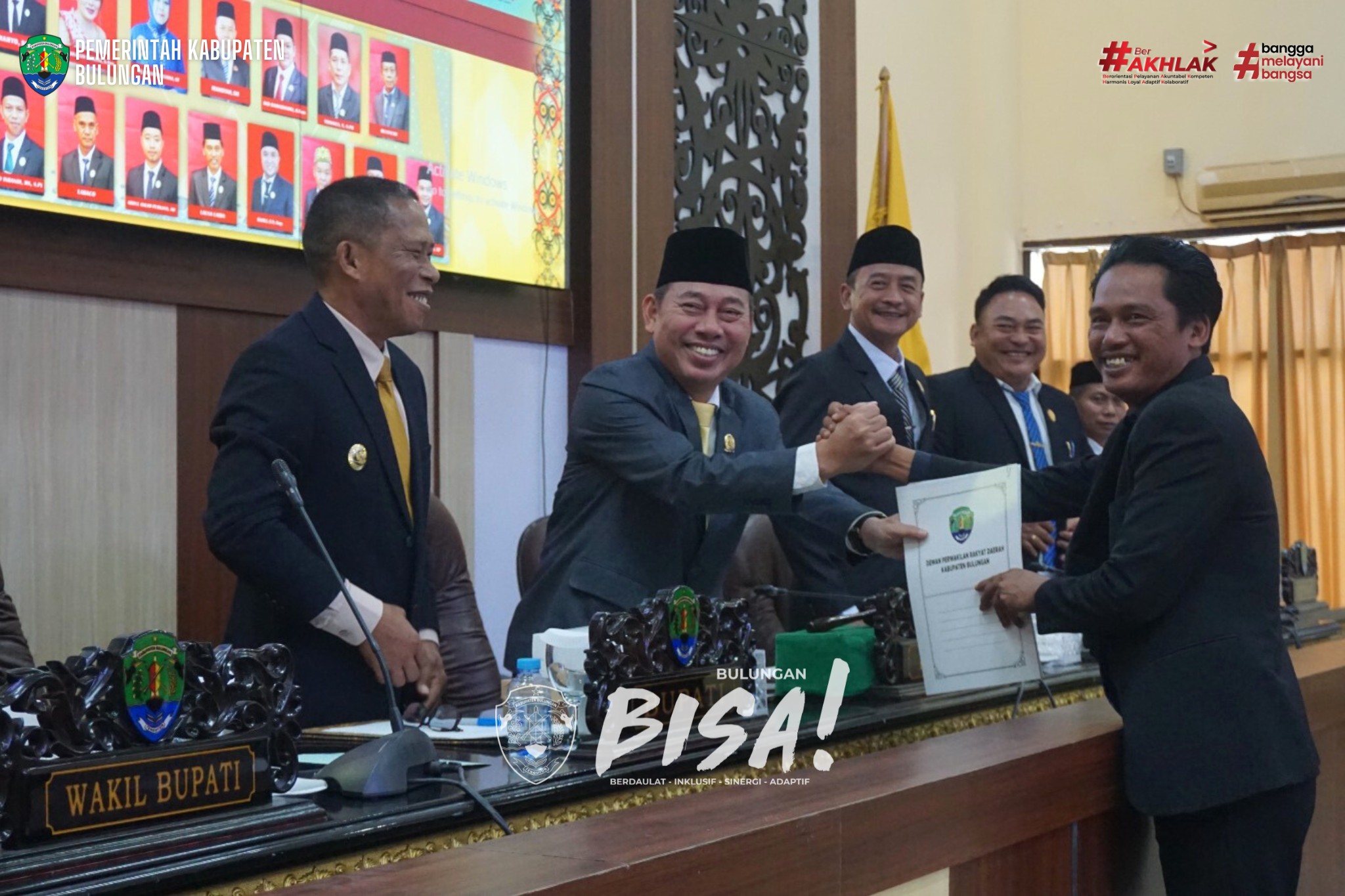 Bupati Bulungan, Syarwani, S.Pd, M.Si menyampaikan terima kasih dan apresiasi atas kerja keras, saran, masukan dan pembahasan yang telah dilakukan DPRD.
