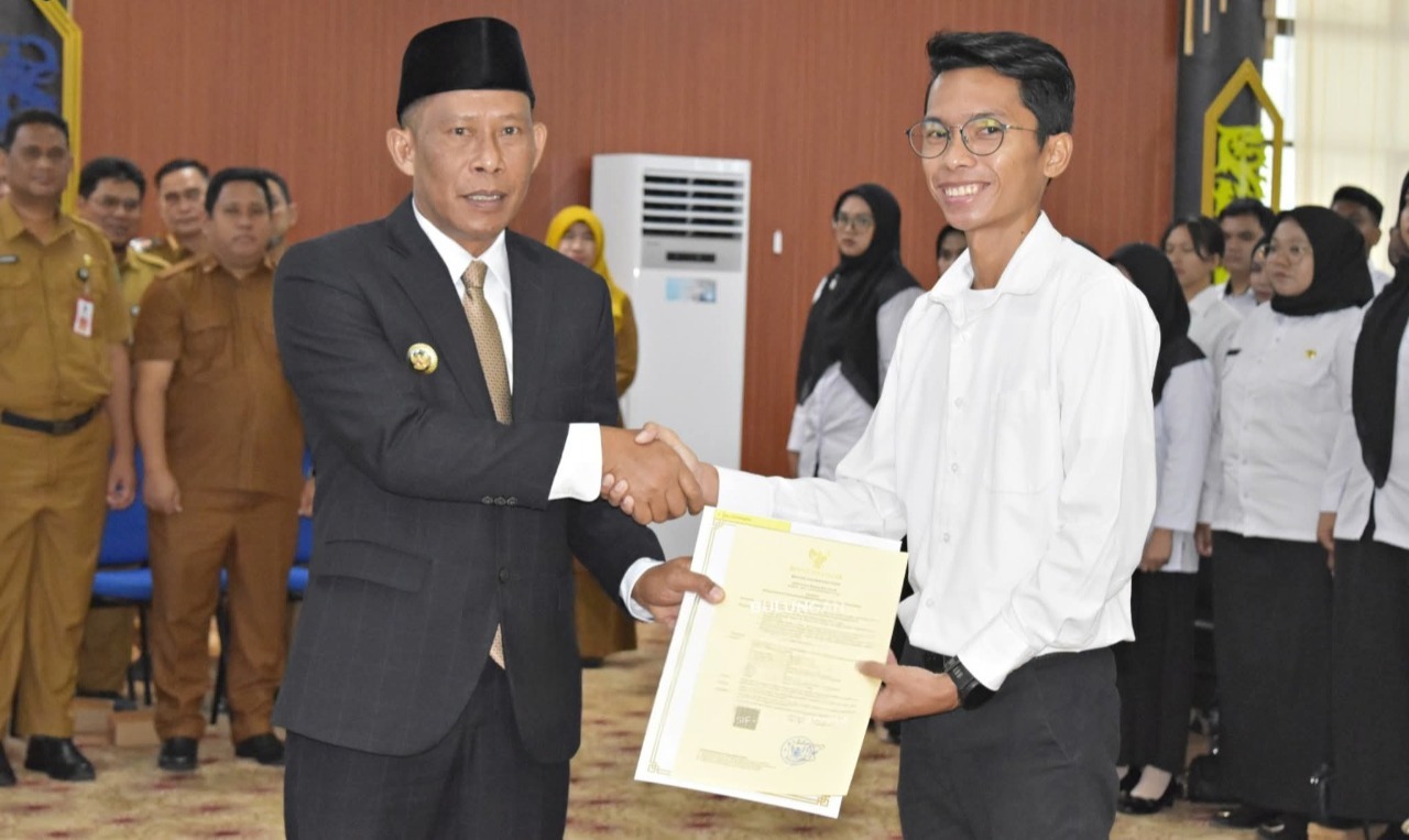 TANJUNG SELOR, Maqnaia – Bupati Bulungan, Syarwani, S.Pd, M.Si menyerahkan SK Pegawai Pemerintah dengan Perjanjian Kerja (PPPK) Tahap II Tahun Anggaran 2024 di Ruang Tenguyun Kantor Bupati pada Selasa (30/9).