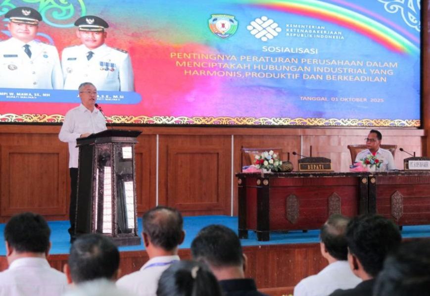 MALINAU, Maqnaia – Bupati Malinau Wempi W Mawa, S.E., M.H., menekankan pentingnya perusahaan melaksanakan seluruh regulasi ketenagakerjaan demi terciptanya hubungan industrial yang harmonis dan berkeadilan.Hal ini disampaikan Bupati Wempi saat membuka Sosialisasi Peraturan Perusahaan, yang digelar di ruang Laga Feratu, Rabu (1/10/2025).