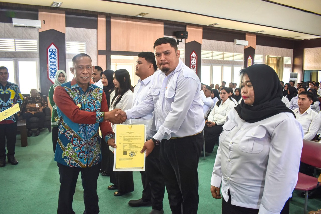 TANJUNG SELOR, Maqnaia – Bupati Bulungan, Syarwani, S.Pd, M.Si menyerahkan SK Pegawai Pemerintah dengan Perjanjian Kerja (PPPK) Paruh Waktu kepada 264 orang di lingkup Pemkab pada Kamis (13/11) di Aula BKPSDM di Jl Agathis,