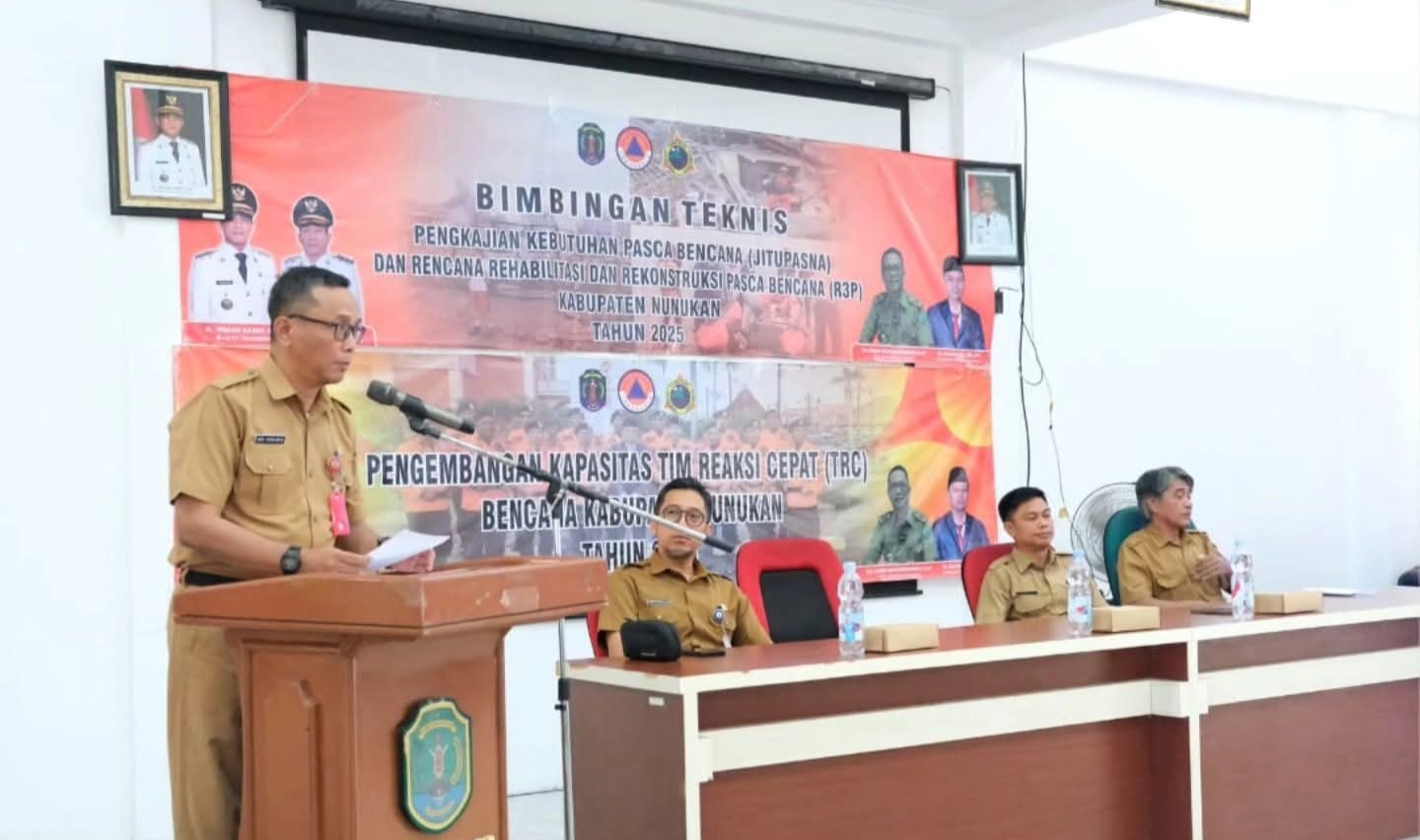 NUNUKAN, Maqnaia – Plt Sekretaris Daerah Kabupaten Nunukan, Raden Iwan Kurniawan, membuka Bimbingan Teknis (Bimtek) BPBD terkait Pengkajian Kebutuhan Pasca Bencana (Jitupasna), Rencana Rehabilitasi dan Rekonstruksi Pasca Bencana (R3P), serta Penguatan Kapasitas Tim Reaksi Cepat (TRC) Kabupaten Nunukan. Kegiatan berlangsung di Ruang Diklat BKPSDM Nunukan, Senin (24/11/2025).