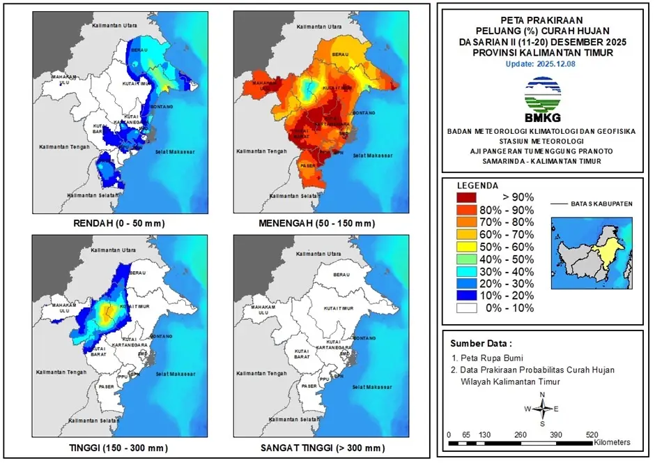 Untuk prakiraan deterministik curah hujan pada Dasarian II Desember 2025, sebagian besar wilayah Kaltim juga diprakirakan berada pada kategori Menengah (50–150 mm).