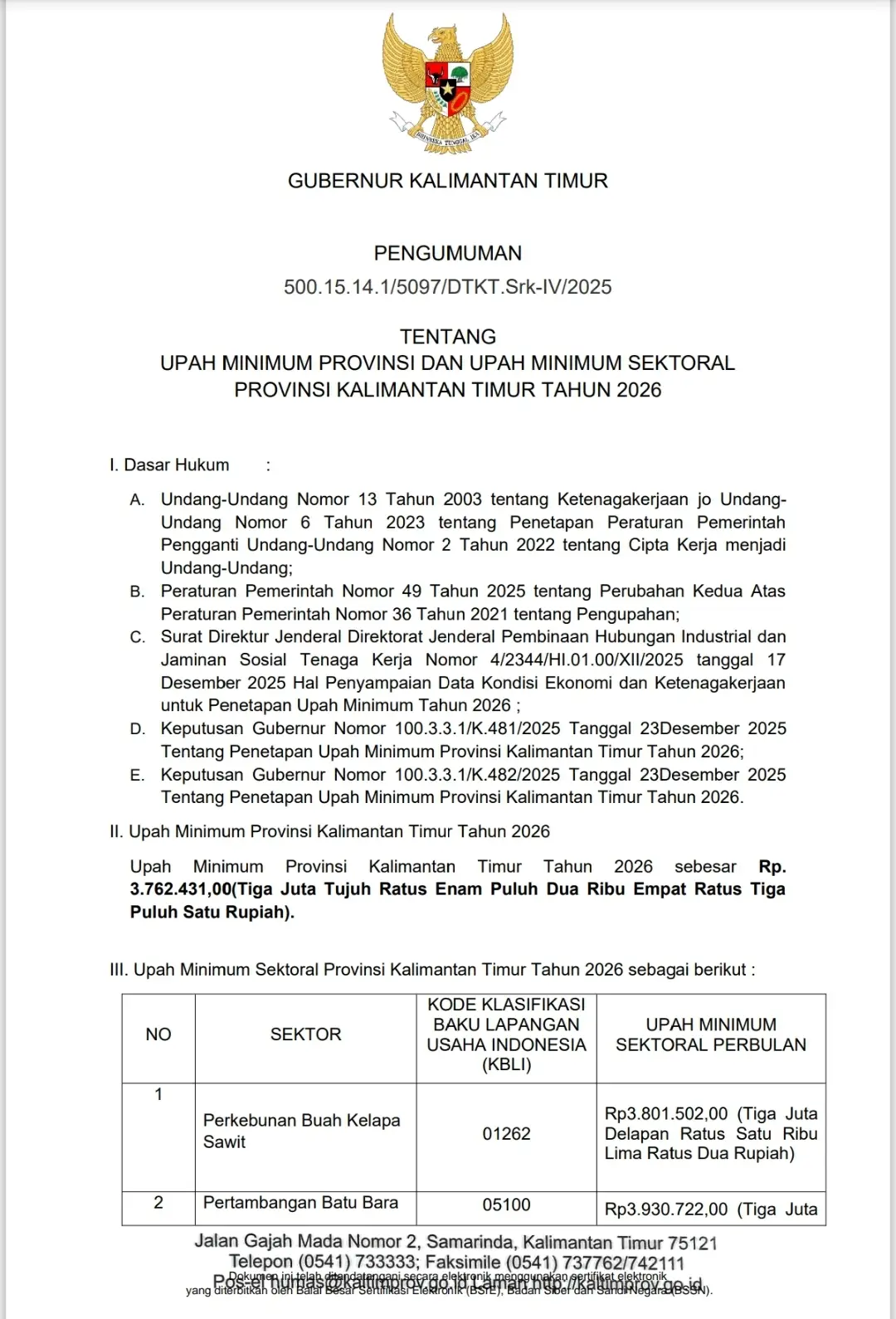 SAMARINDA, Maqnaia – Pemerintah Provinsi Kalimantan Timur resmi menetapkan Upah Minimum Provinsi (UMP) Kalimantan Timur Tahun 2026 sebesar Rp3.762.431,00. Penetapan ini tertuang dalam Pengumuman Gubernur Kalimantan Timur Nomor 500.15.14.1/5097/DTKT.Srk-IV/2025 yang ditetapkan pada 24 Desember 2025.